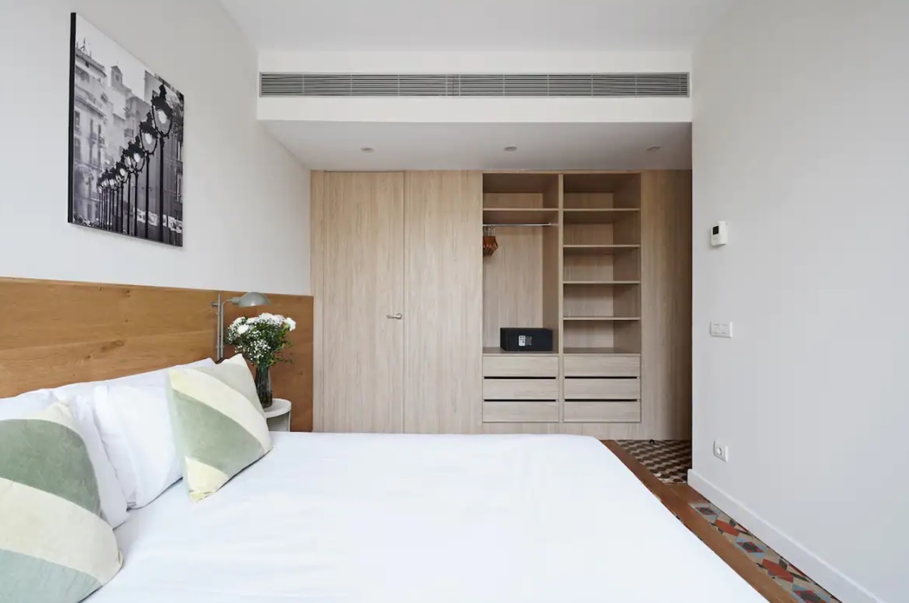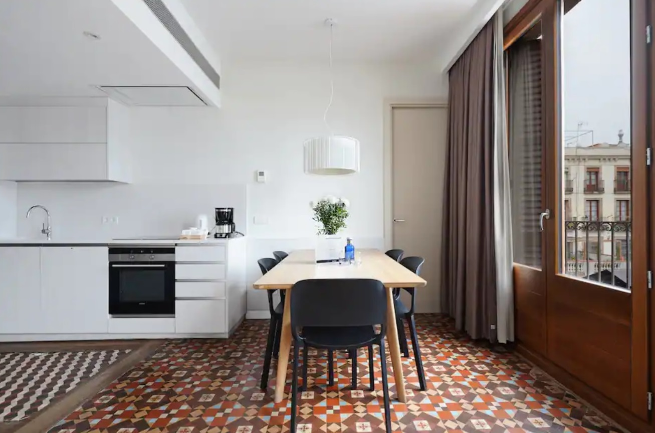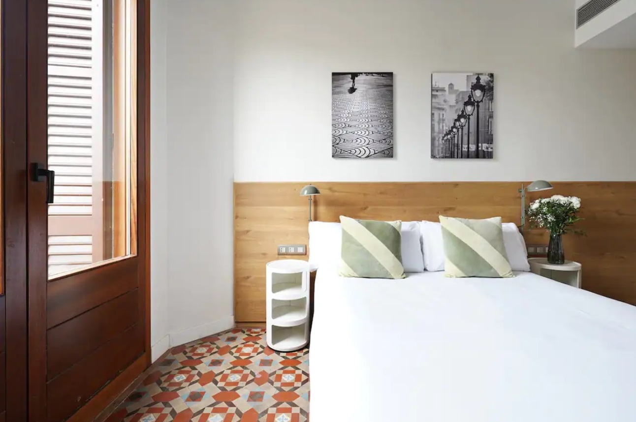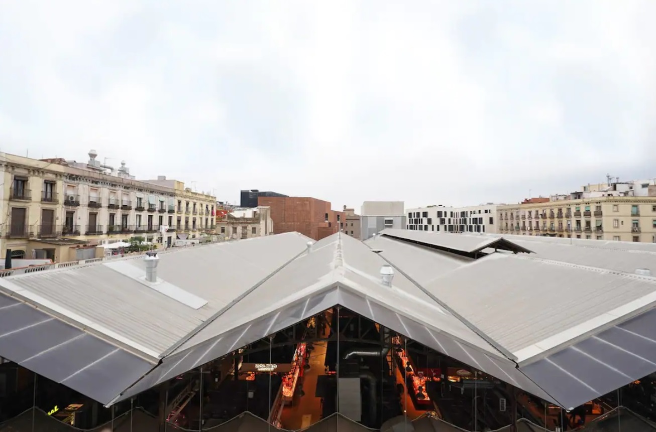 Equipado con cálidos suelos de parquet color miel, este fantástico apartamento está decorado con un estilo moderno y decorado en tonos neutros para crear un ambiente luminoso y fresco perfecto para una estancia única en el centro de Barcelona. El espacioso comedor-salón con una moderna cocina abierta totalmente equipada es la pieza central de esta magnífica propiedad, amueblada con una mesa de comedor de madera y una relajante sala de estar con un sillón y un sofá cama individual. Sus dos pequeñas ventanas del balcón se abren a las vistas, los sonidos y los olores del pintoresco mercado de la Boquería. La zona de descanso consta de dos dormitorios con dos camas individuales y un dormitorio doble con baño privado con ducha. Luminosas y espaciosas, todas están decoradas en tonos de gris compensados por cálidos muebles de madera. El segundo baño con ducha está fuera del pasillo. El apartamento tiene acceso a una increíble terraza comunitaria con excelentes vistas a La Rambla.