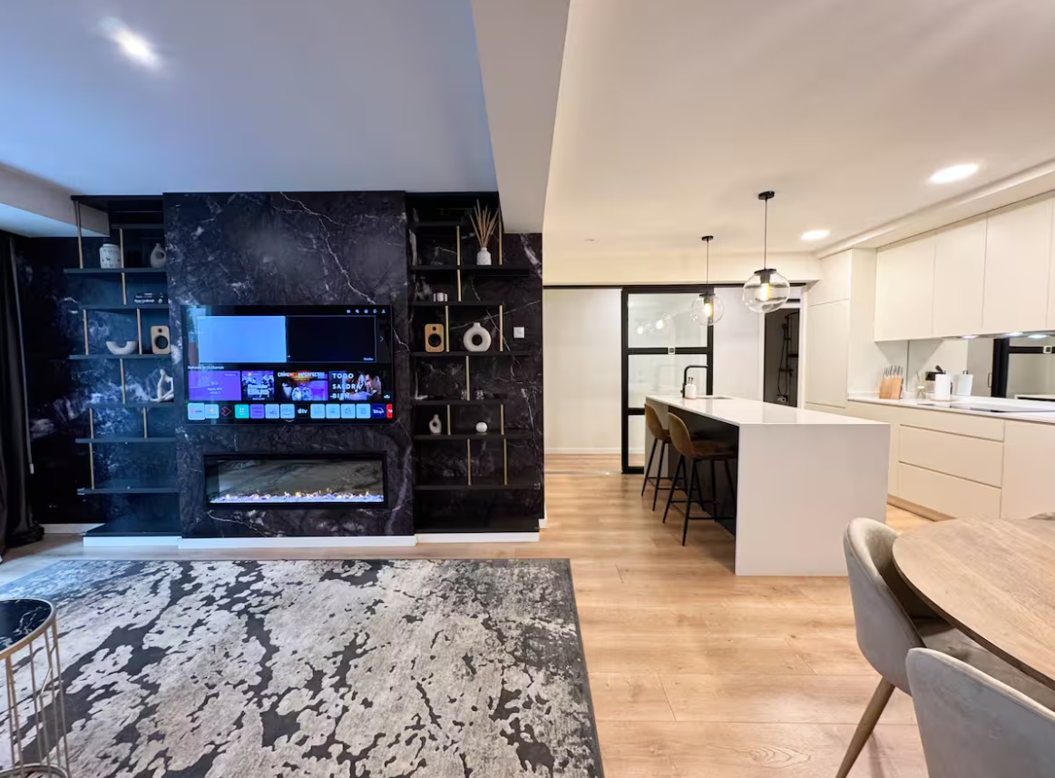 Tres habitaciones, dos baños completos, cocina en isla totalmente equipada, Smart TV con Apple TV, equipo de sonido premium y un patio privado. Aire acondicionado en el salón, chimenea decorativa y lavadora/secadora.