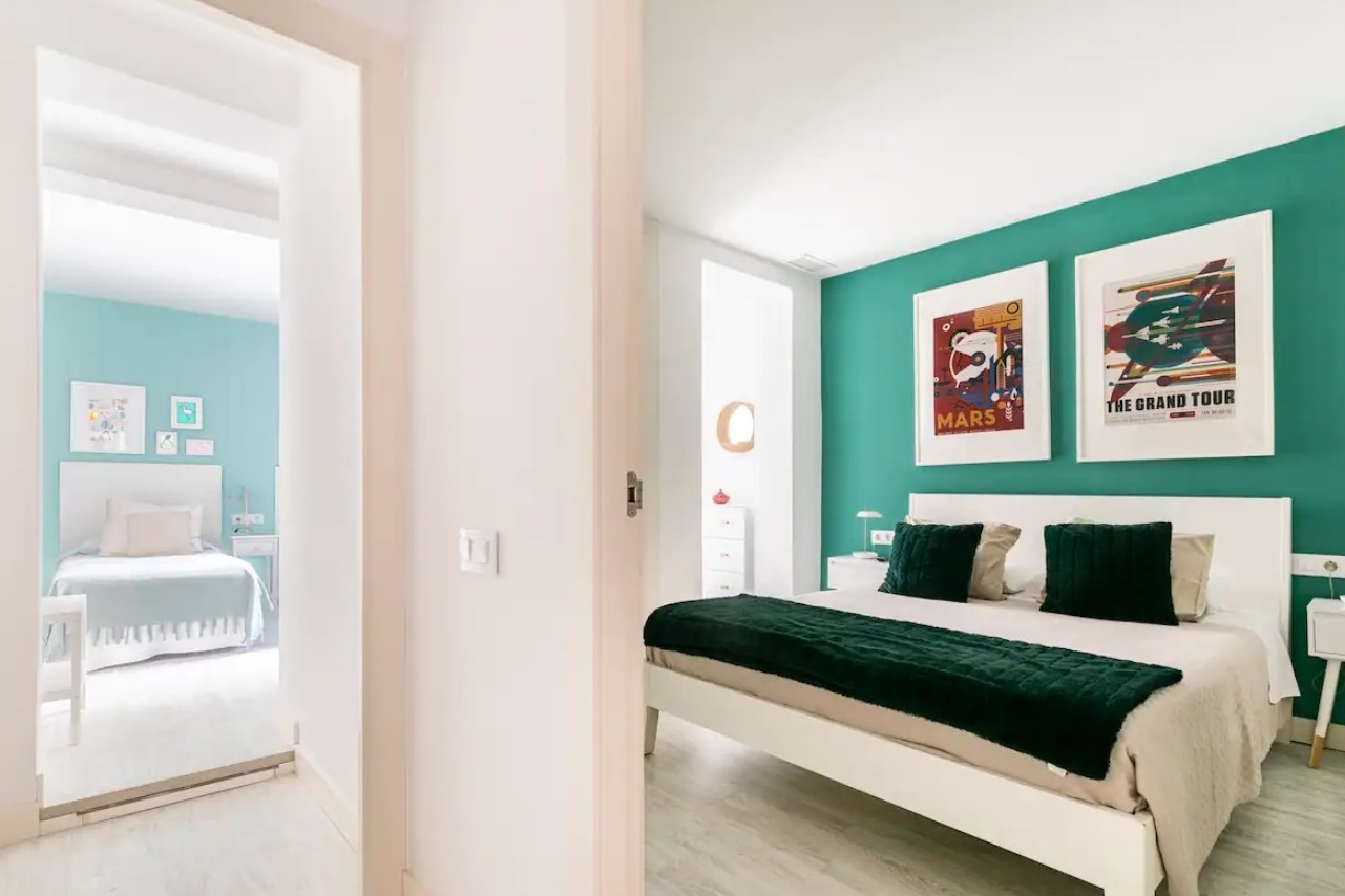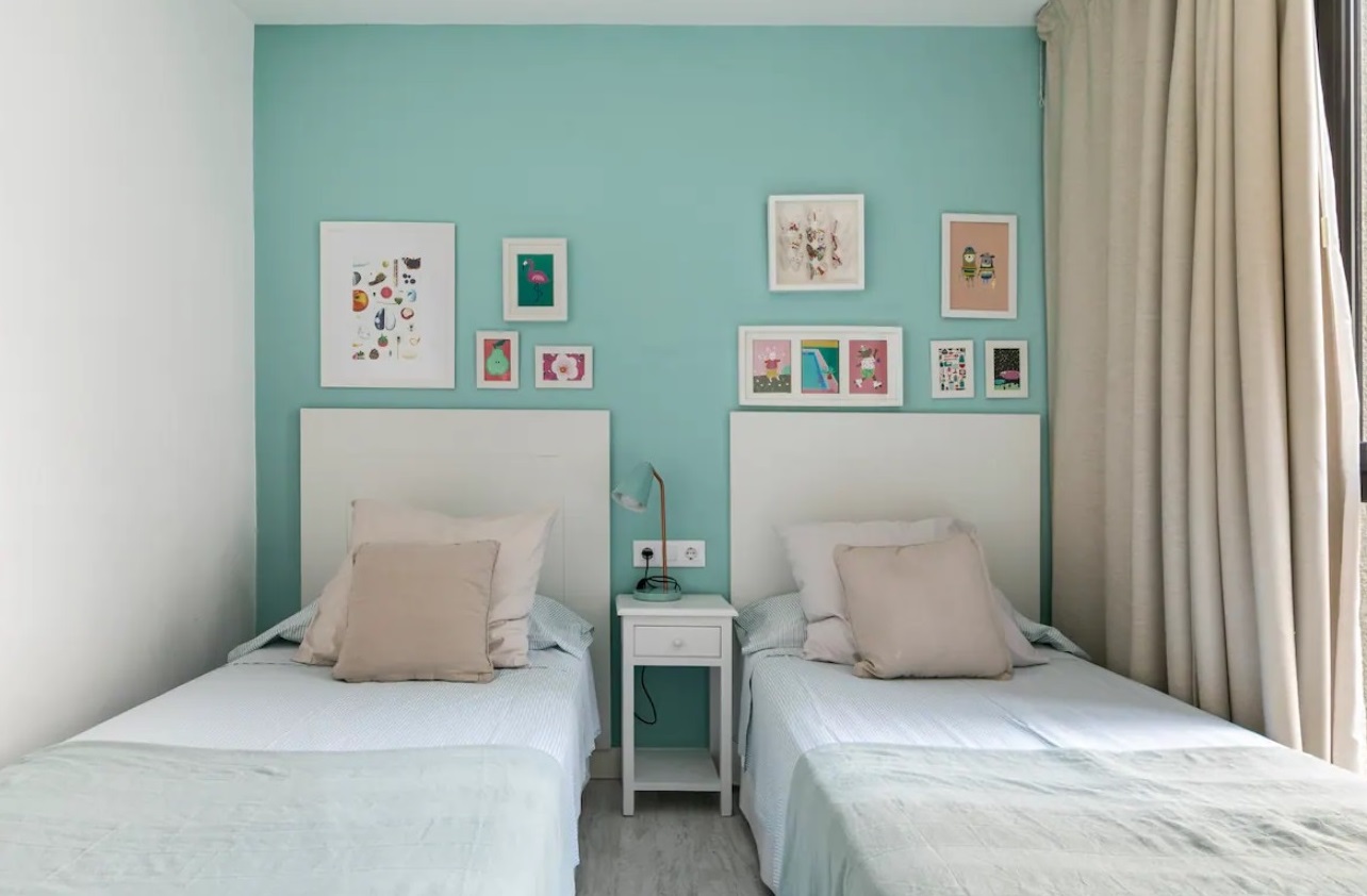 Segundo dormitorio con camas individuales y segundo baño completo en el pasillo.