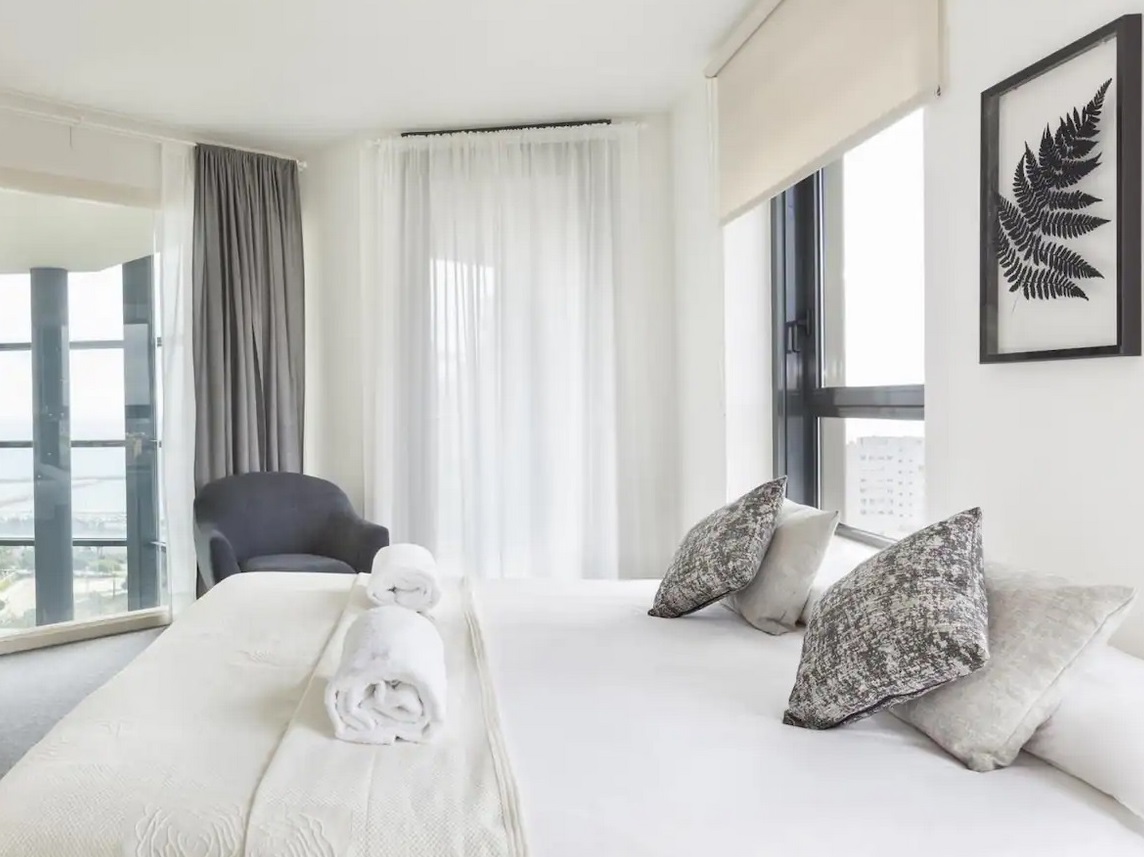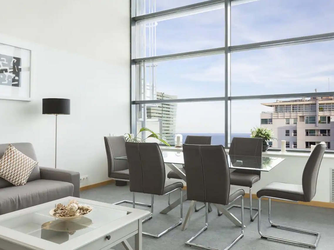 Este lujoso apartamento dispone de 4 dormitorios dobles: el dormitorio principal con una cama de matrimonio y tres habitaciones con dos camas individuales, que pueden devenirse en camas de matrimonio bajo petición. Los 3 cuartos de baño tienen acabados en mármol y tonalidades neutras.El comedor es muy luminoso gracias a los enormes ventanales que, a su vez, ofrece una vista muy bonita del mar. También cuenta con una terraza, equipada con una mesa y sillas.