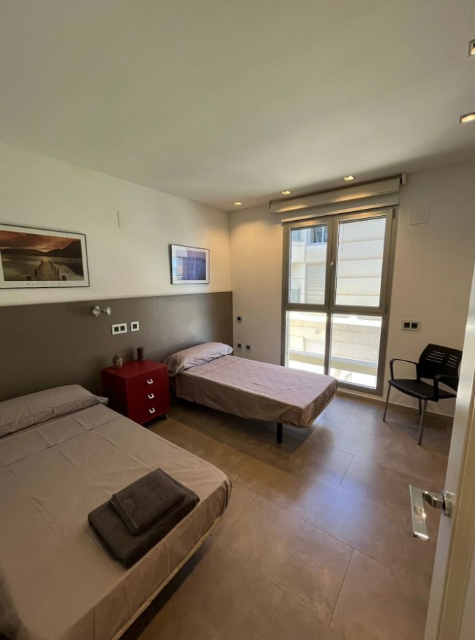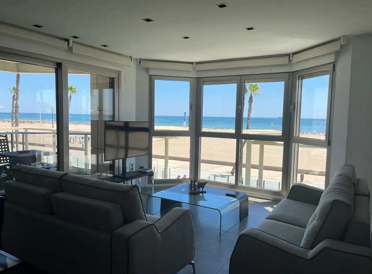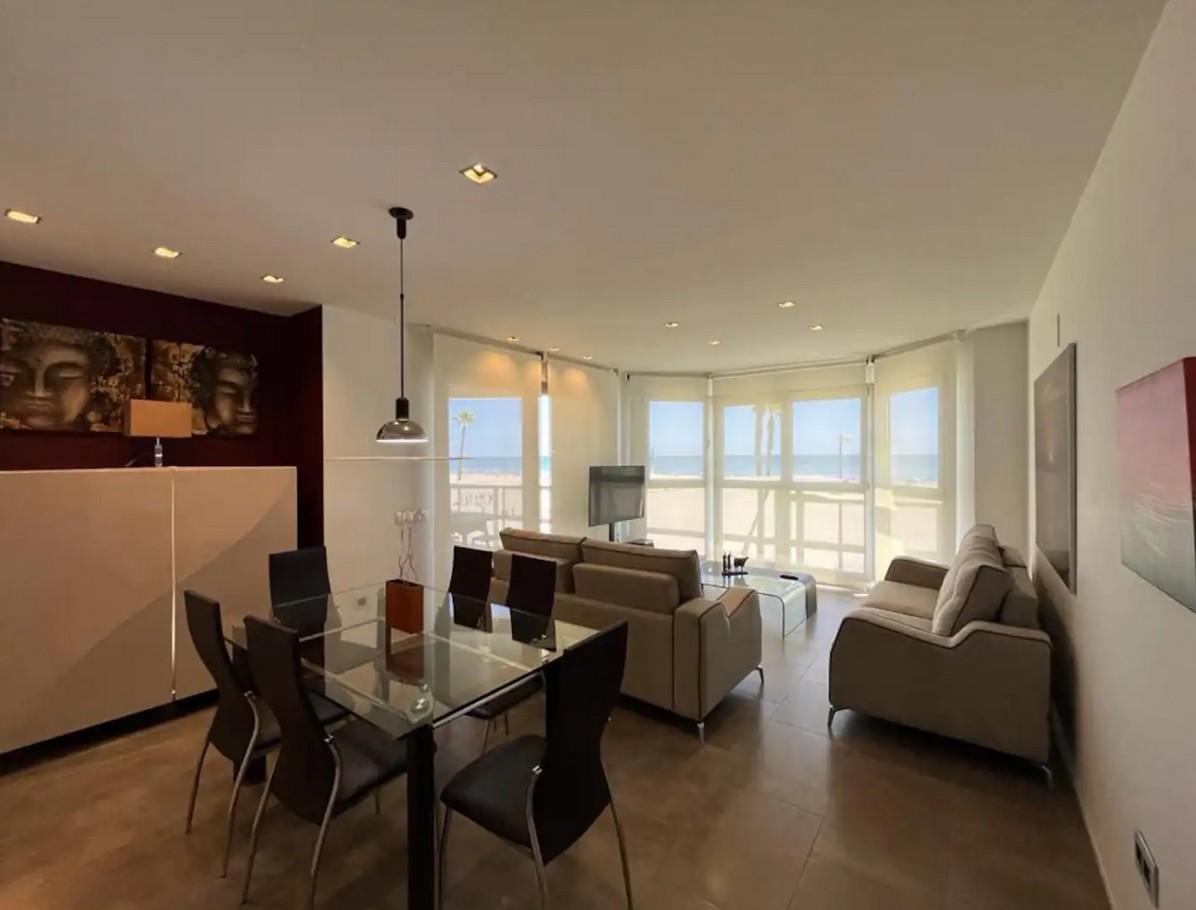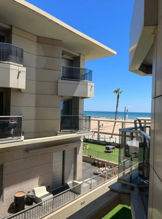 VISTAS DIRECTAS AL MAR. En este apartamento podrás disfrutar unos fabulosos días de playa con tu familia o amigos y relajarte mirando el mar desde casa. El apartamento cuenta con todas las comodidades: wifi, aire acondicionado, PARKING GRATUITO, lavadora, lavavajillas, plancha, tostadora, cafetera, etc. Dispone de transporte público en la avenida, supermercados cerca, paseos en bici, restaurantes, chiringuitos, etc. El apartamento está situado en la primera planta, con vistas directas al mar desde el salón, terraza y dormitorio principal. Cuenta con 2 habitaciones -una de matrimonio y otra con dos camas individuales-, 2 baños -uno dentro de la habitación principal, cocina, grandes armarios y unas magnificas vistas al paseo y al mar. También hay PARKING GRATUITO subterráneo incluido en las instalaciones. El edificio cuenta con una zona ajardinada comunitaria junto al paseo donde poder relajarse, sentarse a leer o comer. También cuenta con una ducha para quitarse la arena antes de subir al apartamento y baños en planta baja.