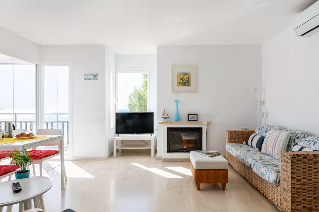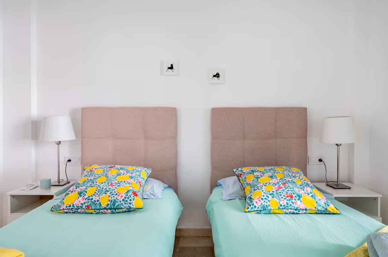 Tiene capacidad para 4 personas, viene totalmente equipado y los huéspedes se benefician del uso de todas las instalaciones del hotel: piscinas al aire libre y cubiertas, gimnasio, sala de vapor, solárium en la azotea, acceso directo al mar con un corto paseo hasta una playa de arena. El apartamento tiene una amplia sala de estar con comedor, una cocina totalmente equipada, dos dormitorios, uno principal con cama tamaño súper king, con acceso directo a la terraza y otro con 2 individuales, ambos con luces de ventilador y persianas en las ventanas, 2 baños, 1 en suite para el principal. Cuenta con una espaciosa terraza con vistas panorámicas a la bahía de Palma y está equipada con mesa de comedor, sillas y una parrilla/barbacoa eléctrica al aire libre.