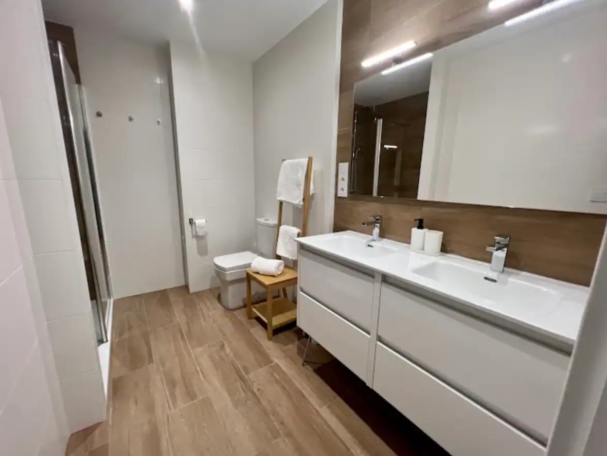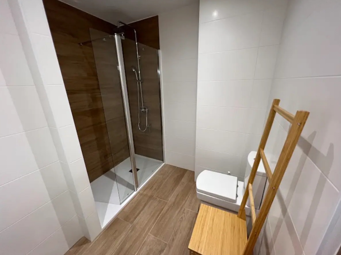 El baño tiene una ducha espaciosa, cómoda y de fácil acceso. Mueble cajonero con dos senos, inodoro y silla de madera bambú toallero.