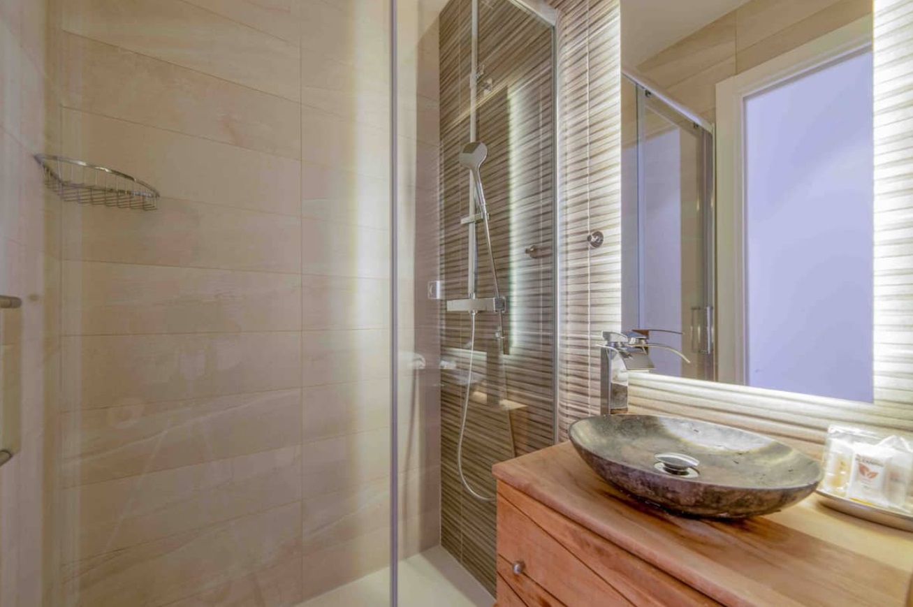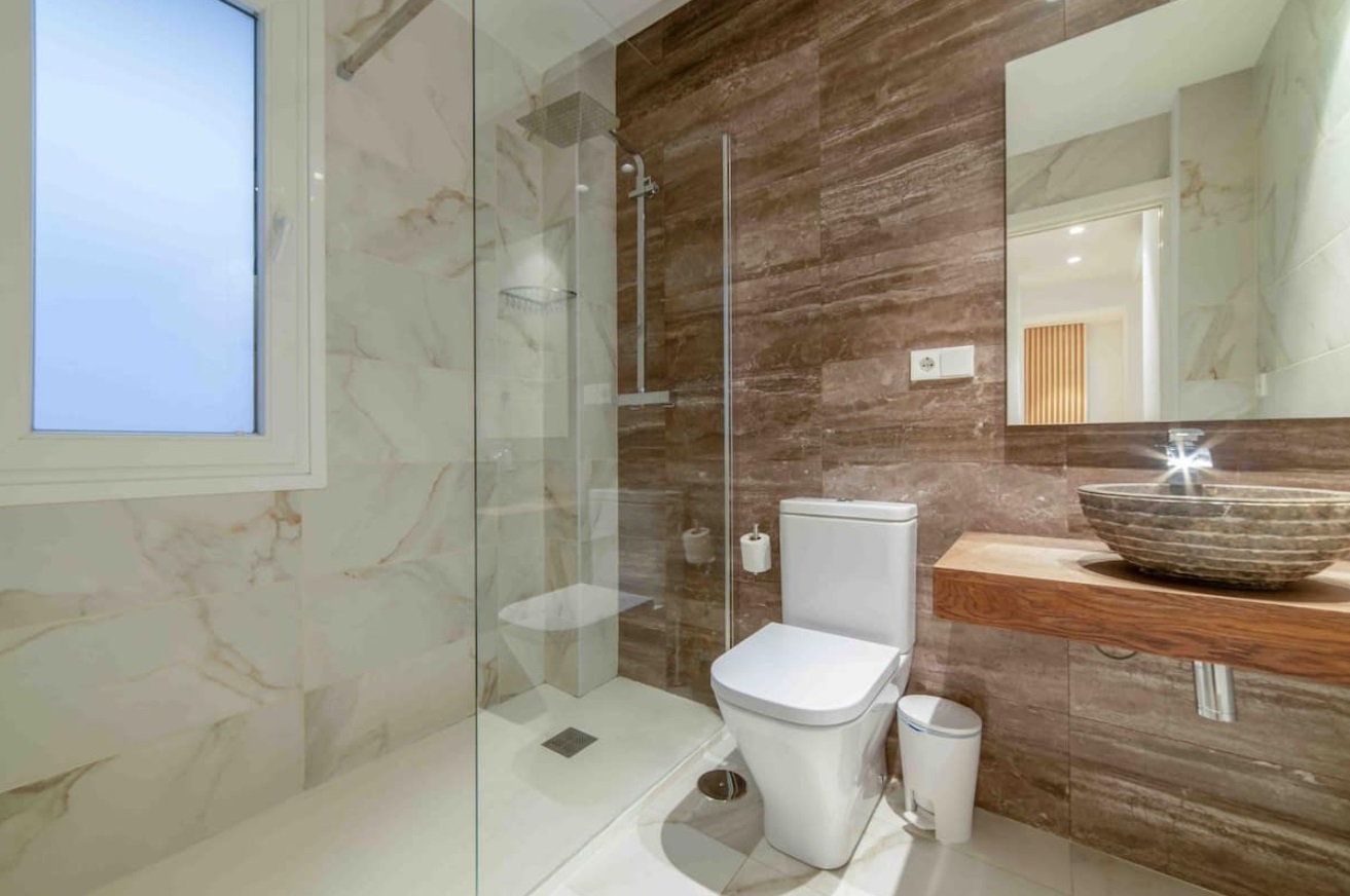 Otro baño modernos y completo con plato de ducha, fuera de las habitaciones.