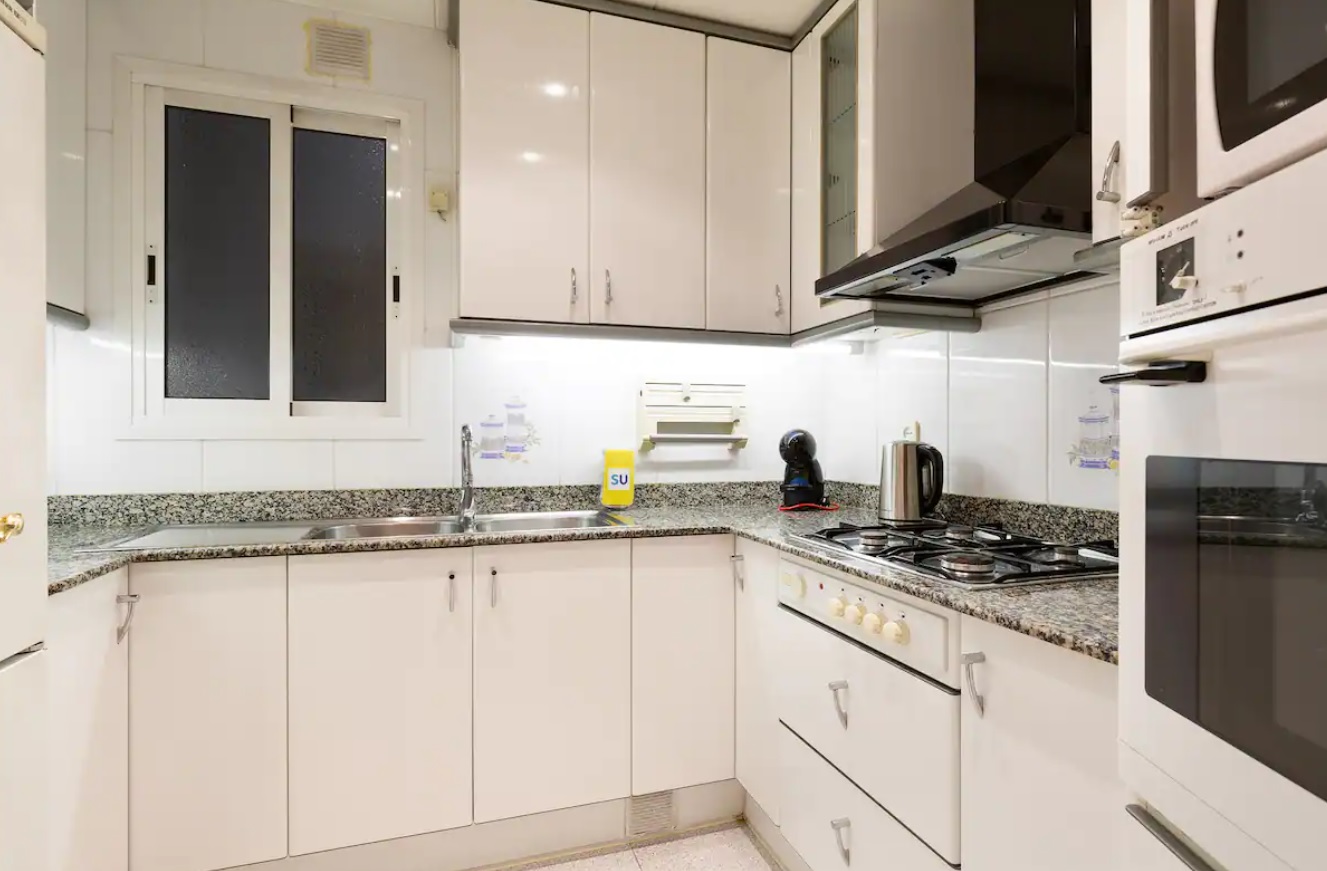 Si bien es posible que desee pasar su tiempo explorando los famosos restaurantes de Barcelona, a veces no hay nada como una comida casera. Y este apartamento cuenta con una cocina totalmente amueblada con todo lo necesario para facilitar la preparación de la comida. Los gabinetes personalizados ofrecen mucho espacio para guardar los comestibles favoritos de su familia, y los modernos electrodomésticos, incluido un lavavajillas silencioso, facilitan la preparación de comidas para su equipo hambriento.